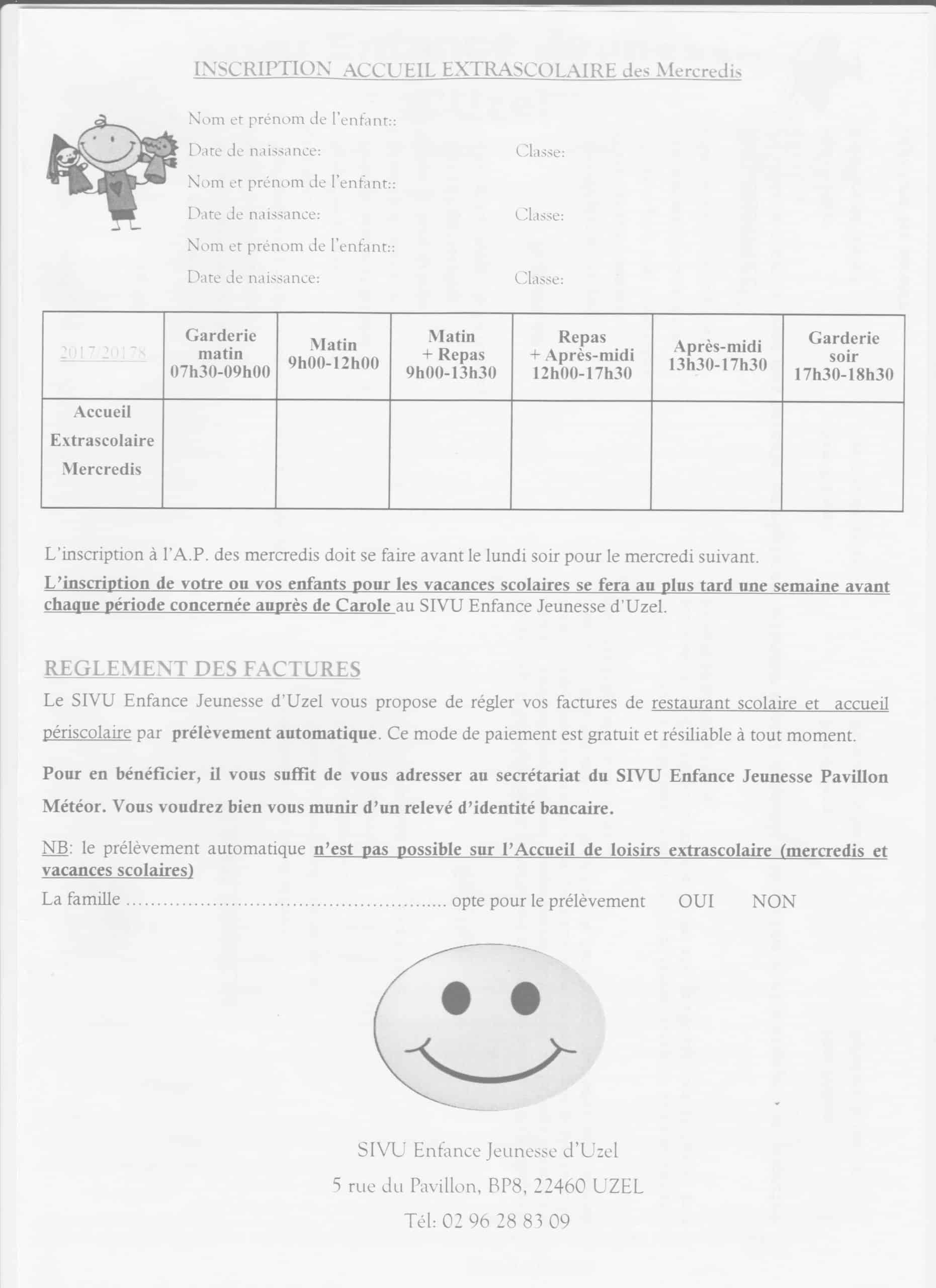 - Pour les enfants scolarisés dans les écoles d’Uzel : veuillez remplir la fiche d’inscription à l’accueil de loisirs et les pièces complémentaires et la remettre à la direction du SIVU Enfance Jeunesse accompagnée du règlement à l’ordre du trésor public.